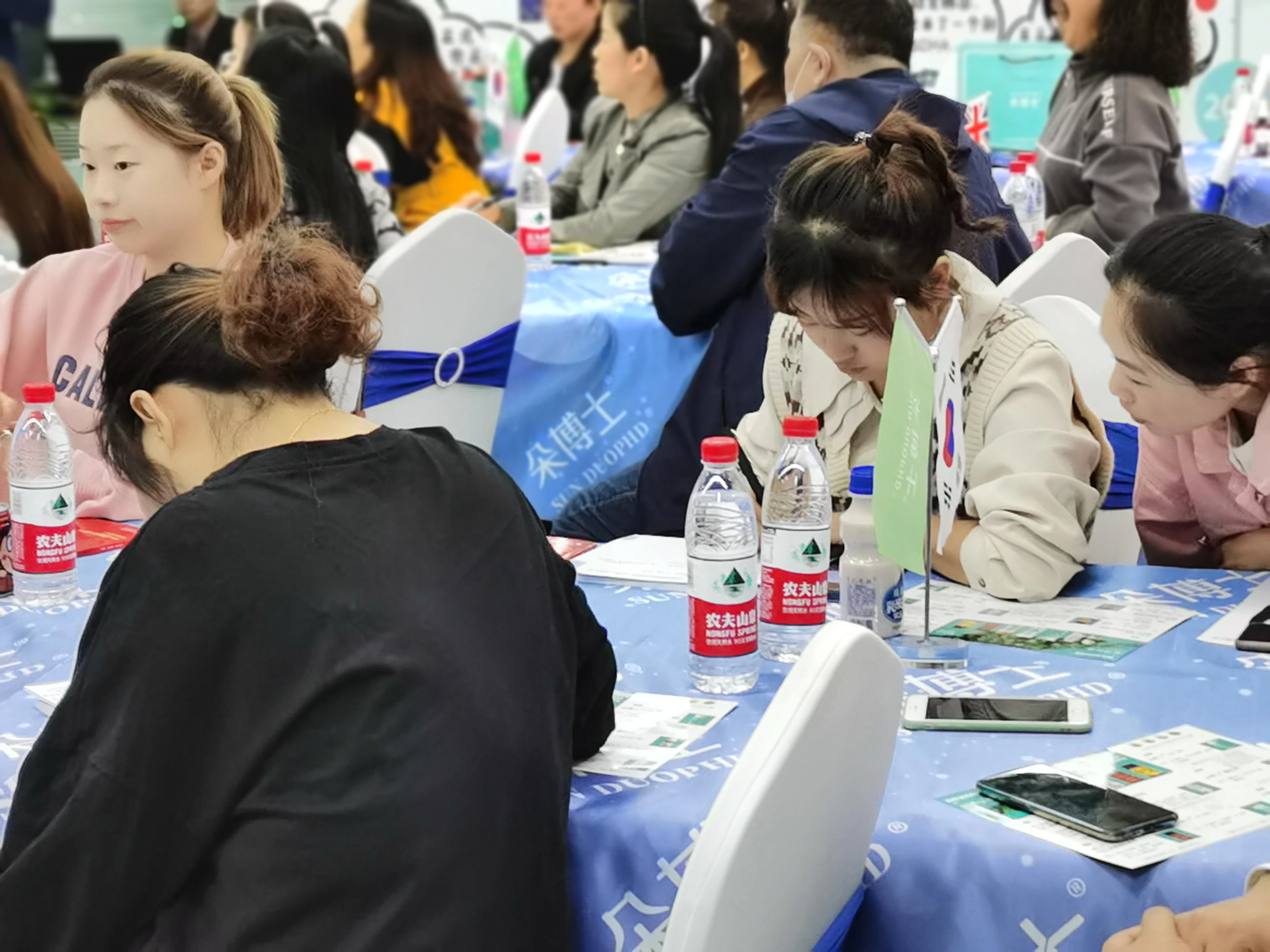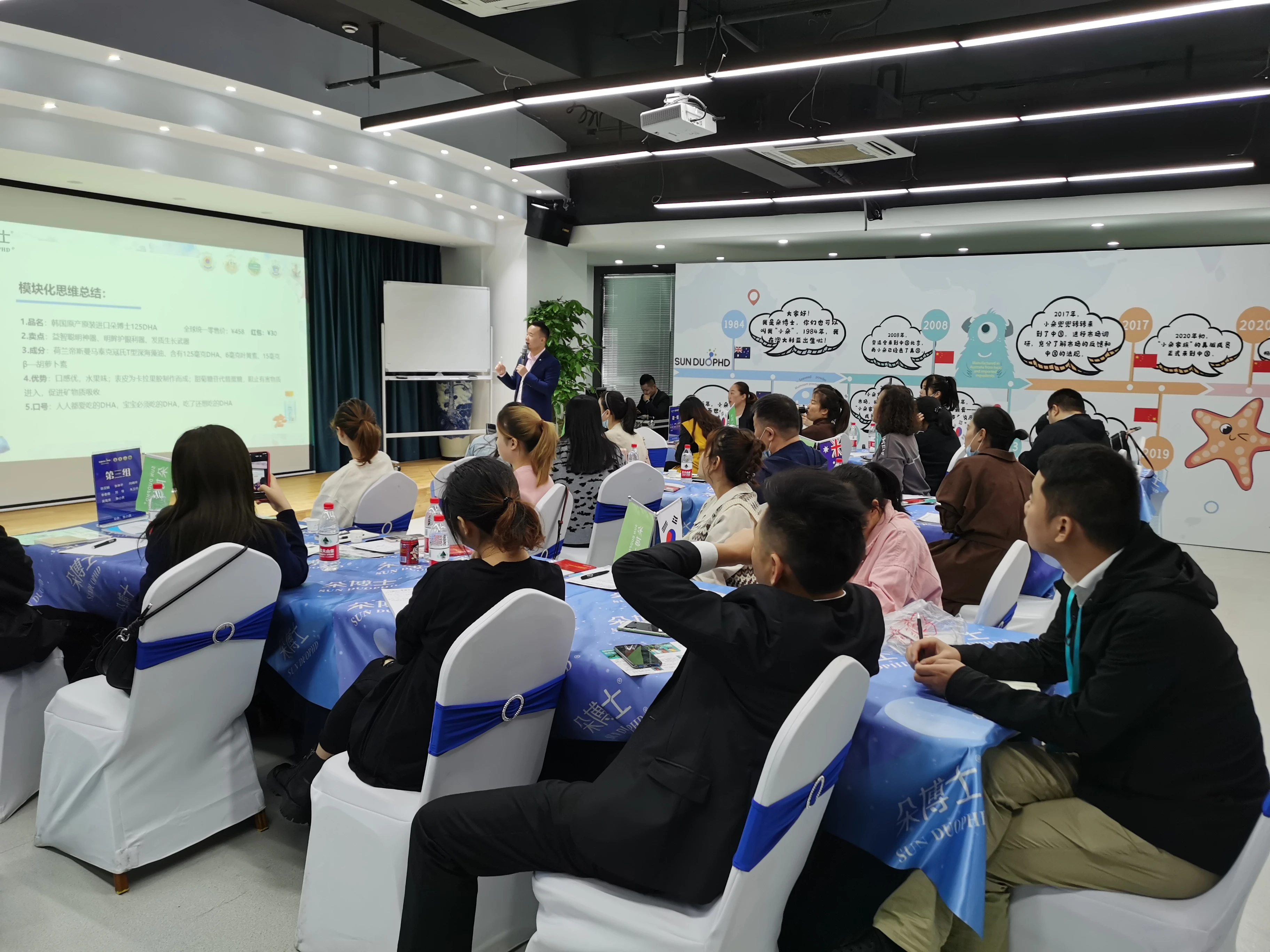 一个品牌要想吸引并留住消费者,产品实力必不可少。所以,第一天的课程主要是朵博士产品知识讲解和模块化思维训练。云尚老师和蓝馨老师等朵博士资深培训师从朵博士旗下产品的原料、含量、所获专利、以及与其他同类产品的不同,让所有前来合作伙伴了解了朵博士的产品实力,增加了他们对朵博士的品牌认同感。不仅是讲解,期间还有朵博士125DHA和胶原蛋白肽与同类产品的试吃。所谓实践出真知,经过产品试吃,门店老板或员工对朵博士与其他品牌产品的区别有了直观的感受。一天的学习结束,朵博士还安排了产品知识考试,对一天所学知识进行巩固和学习成果的检测。
